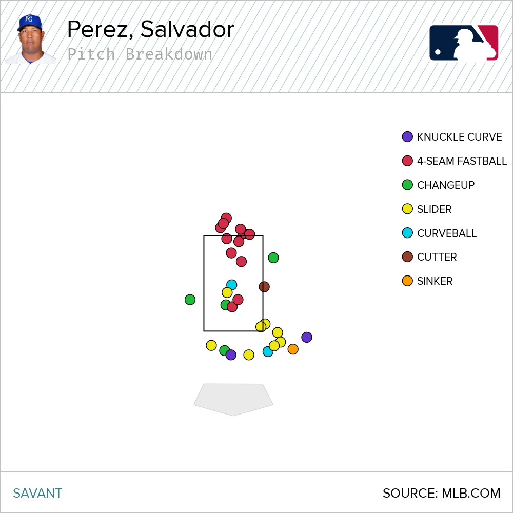 The next two Royals with a bit of swing and miss in their game, have similar difficulties with the slider. Salvador Perez misses on just over 16 percent of his swings.