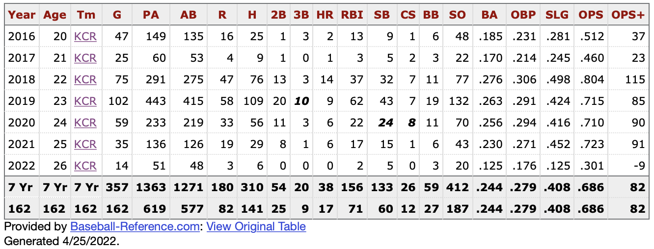 I’m looking at his Baseball-Reference page and thinking that if he somehow plays through May and doesn’t spontaneously combust, that would be the third-most games he’s ever played in a major league season. So on one hand, you can still bank on potential and the fact he had a difficult time staying healthy or that the Royals didn’t do him any favors earlier in his career with how they handled him. But on the other hand…THERE’S EVERYTHING ELSE.