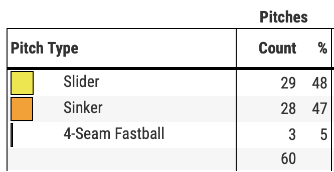 Singer threw 60 pitches before he was yanked in the third without retiring a batter in that inning. Of those 60, here’s the breakdown.