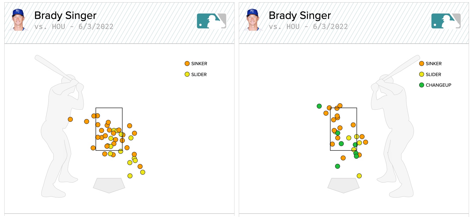 Now, while I did say Singer didn’t have a lot of opportunity to offer the change on Friday, it is worth noting that it was the second start in a row where he threw less than ten. That’s after throwing 16 changeups in each of his first two starts of 2022.
