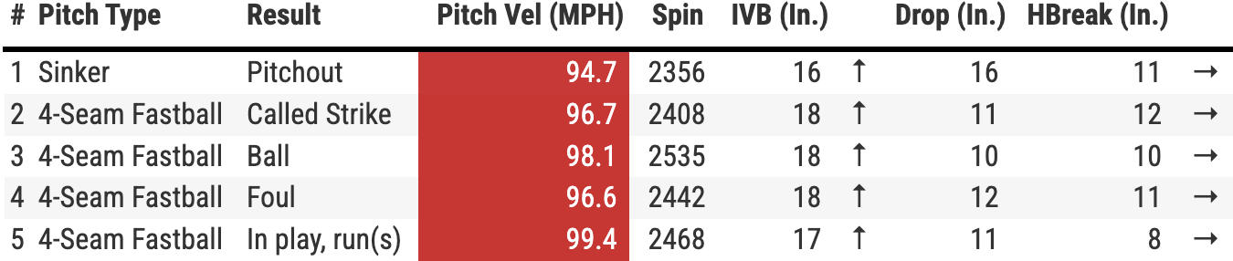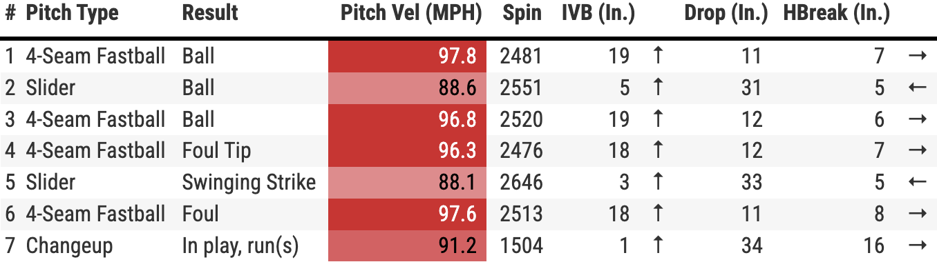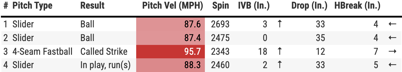The third pitch was a courtesy four-seamer to get a strike. The fourth pitch was another slider. This one was elevated and in the zone. There would not be a fifth pitch.