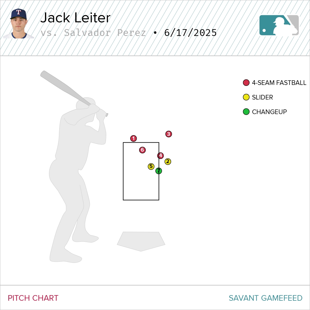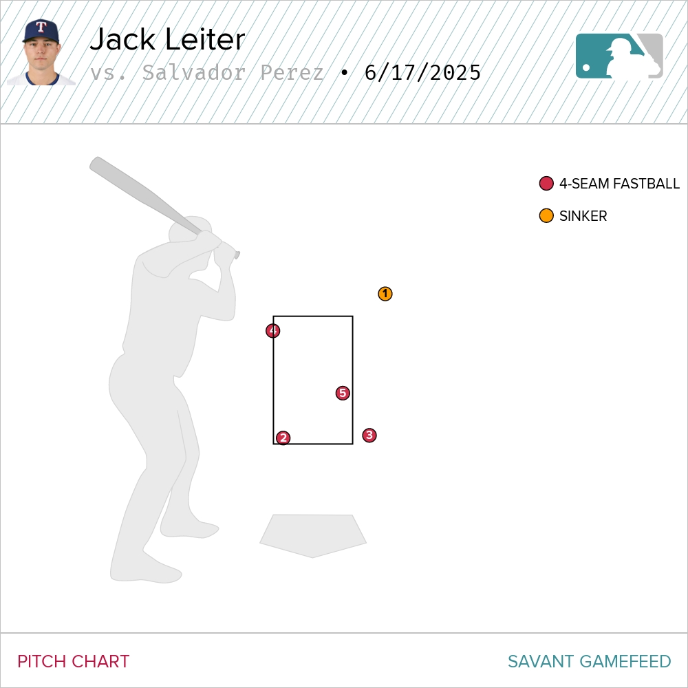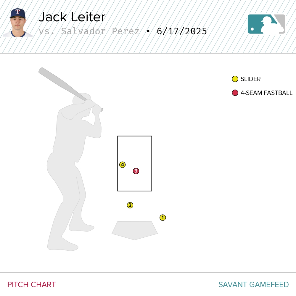 In Perez’s second confrontation with Leiter, the Rangers right-hander kept throwing the four-seamer, but this time did mix in a couple of sliders and a changeup. Leiter missed on his first three pitches and fell behind 3-0.