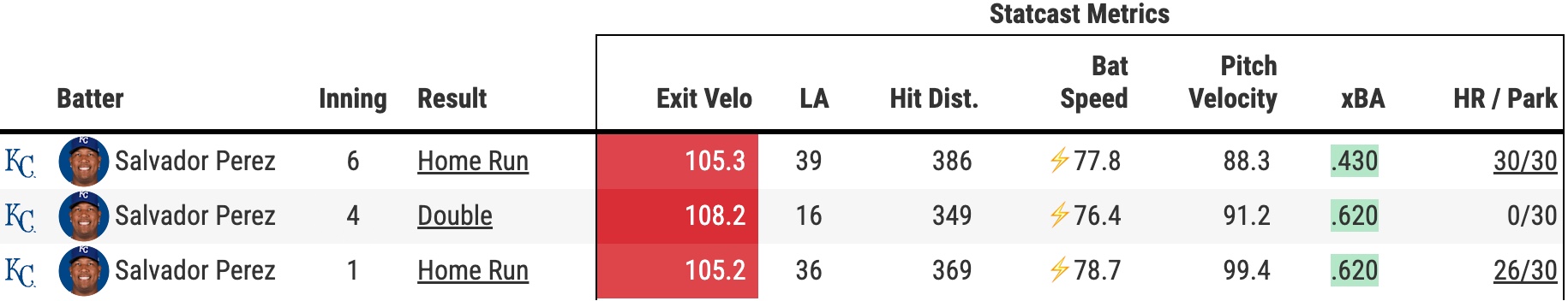 What caught my attention beyond the exit velocity and the way Perez completely owned Leiter on the night was the fact that Salvy was swinging the bat with some serious intent. Perez’s average bat speed this season is around 73 mph. His average speed on his swings where he put the ball in play was just south of 78 mph.