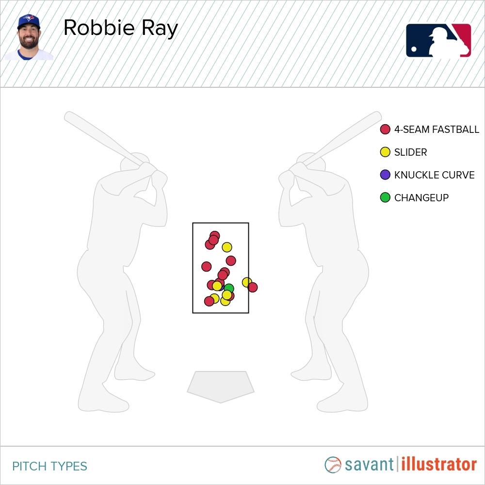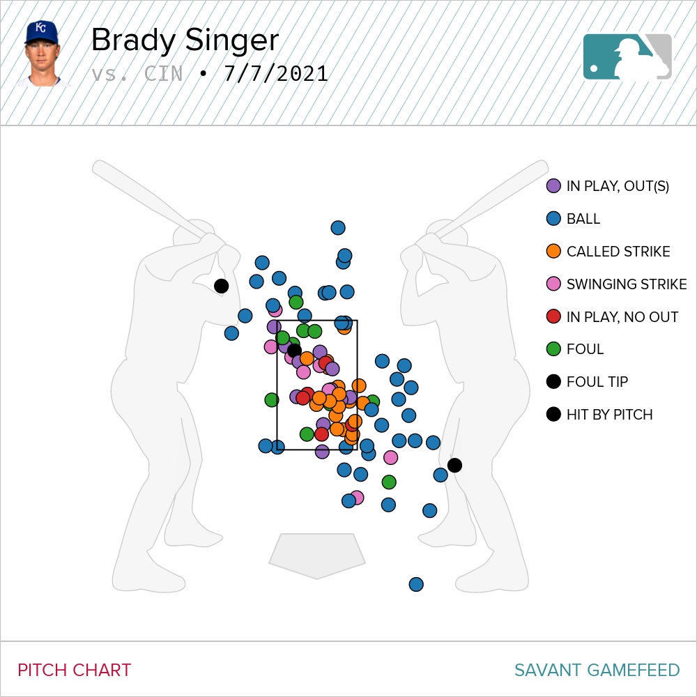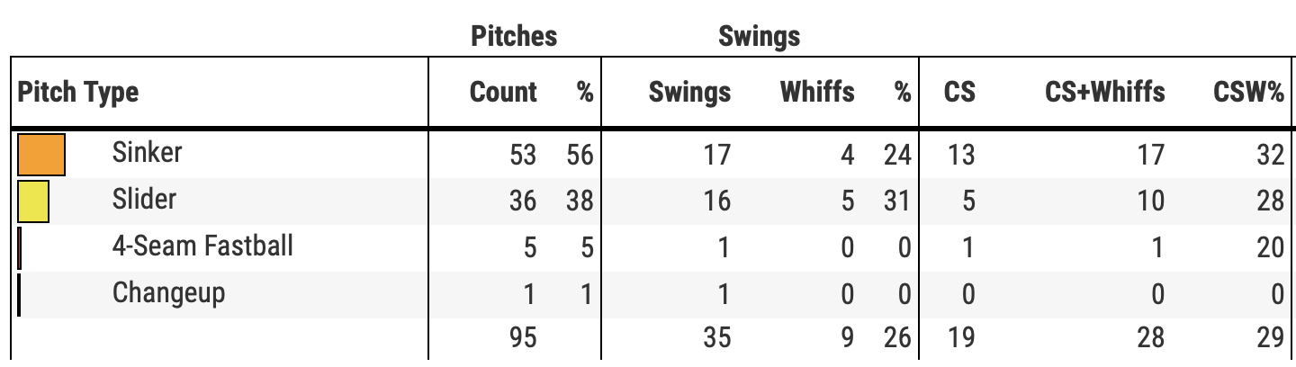 Singer, as is typical, relied almost exclusively on his sinker/slider combo for most of the afternoon. He offered a four-seamer on five occasions. His changeup was thrown once.