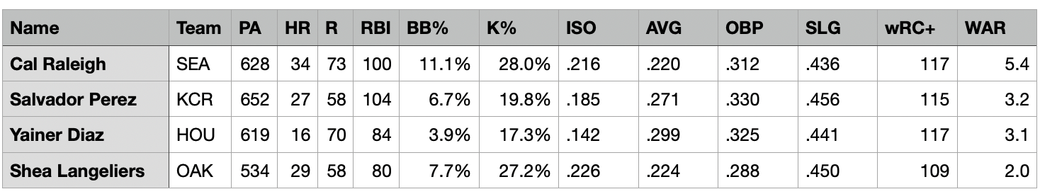 I think you can make a case for any of the top three. Perez drove in the most runs. Raleigh hit the most home runs and scored the most runs. Diaz leads this group in batting average. Perez is the leader in OBP (which still blows my mind) and slugging. Raleigh and Diaz are tied with wRC+, with Perez right behind.