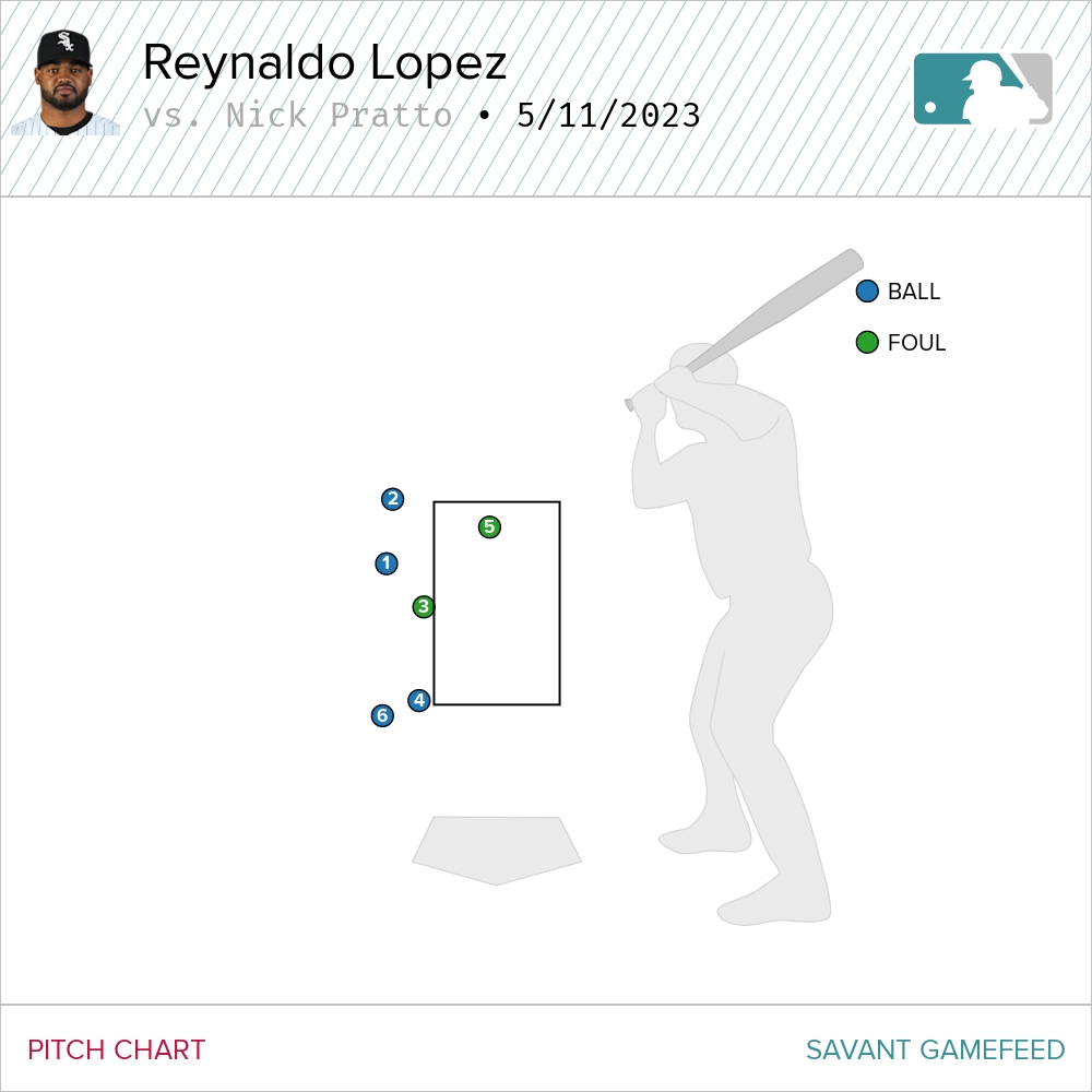 It’s just a nice plate appearance. Pratto watched the first two pitches well outside to get ahead 2-0. He let it fly on the third pitch, which was just off the plate, and fouled it off. After watching another fastball to reach a favorable 3-1 count, Lopez uncorked a high strike that Pratto again fouled off.
