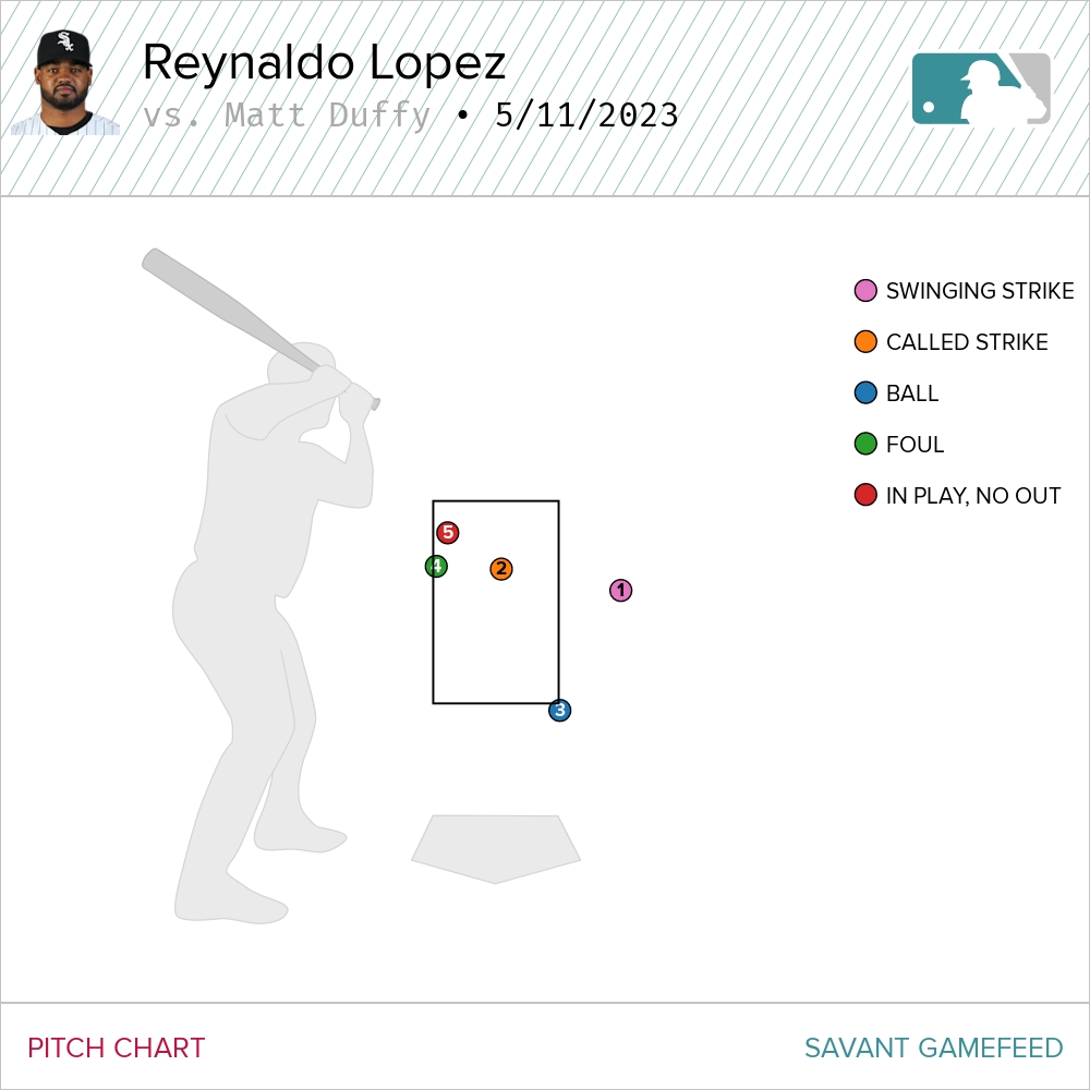 Down 0-2 this was the opposite of Pratto’s plate appearance. Duffy dug himself a hole, but he had seen both of Lopez’s offerings. Maybe that helped because he was able to hold off on another slider that dropped out of the zone for a ball. Duffy then fouled off a 100 MPH heater on the inside corner. Lopez went back to pretty much the same location with the same pitch, just caught a bit more of the plate.