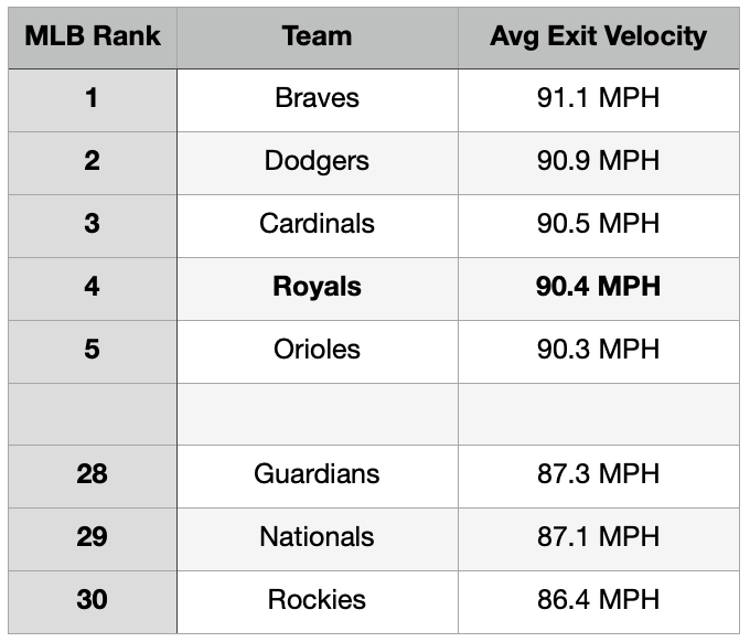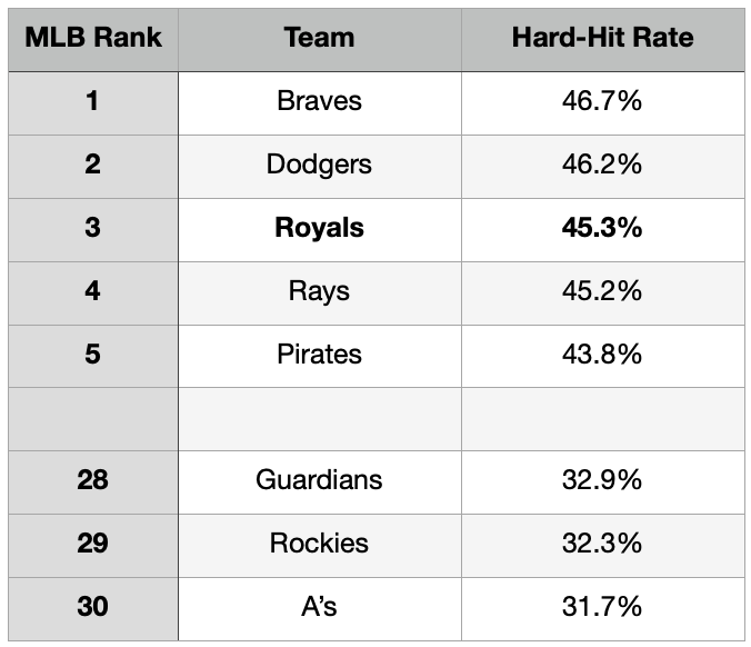 The Royals are still doing extremely well in both categories. Prior to Wednesday, they were third in the majors in batted balls that are considered Hard-Hit (an exit velocity greater than 95 MPH).