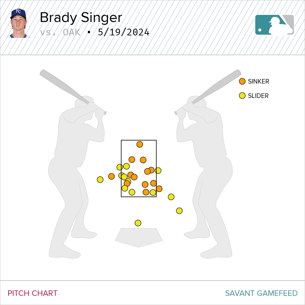 The finale on Sunday featured starter Brady Singer riding his sinker/slider combo to nine strikeouts. Of the 89 pitches he offered Oakland on the afternoon, only eight of them were four-seamers and just three were changeups. To his credit, though, the four-seamer rode high in the zone and generated two whiffs and two fouls on four total swings.