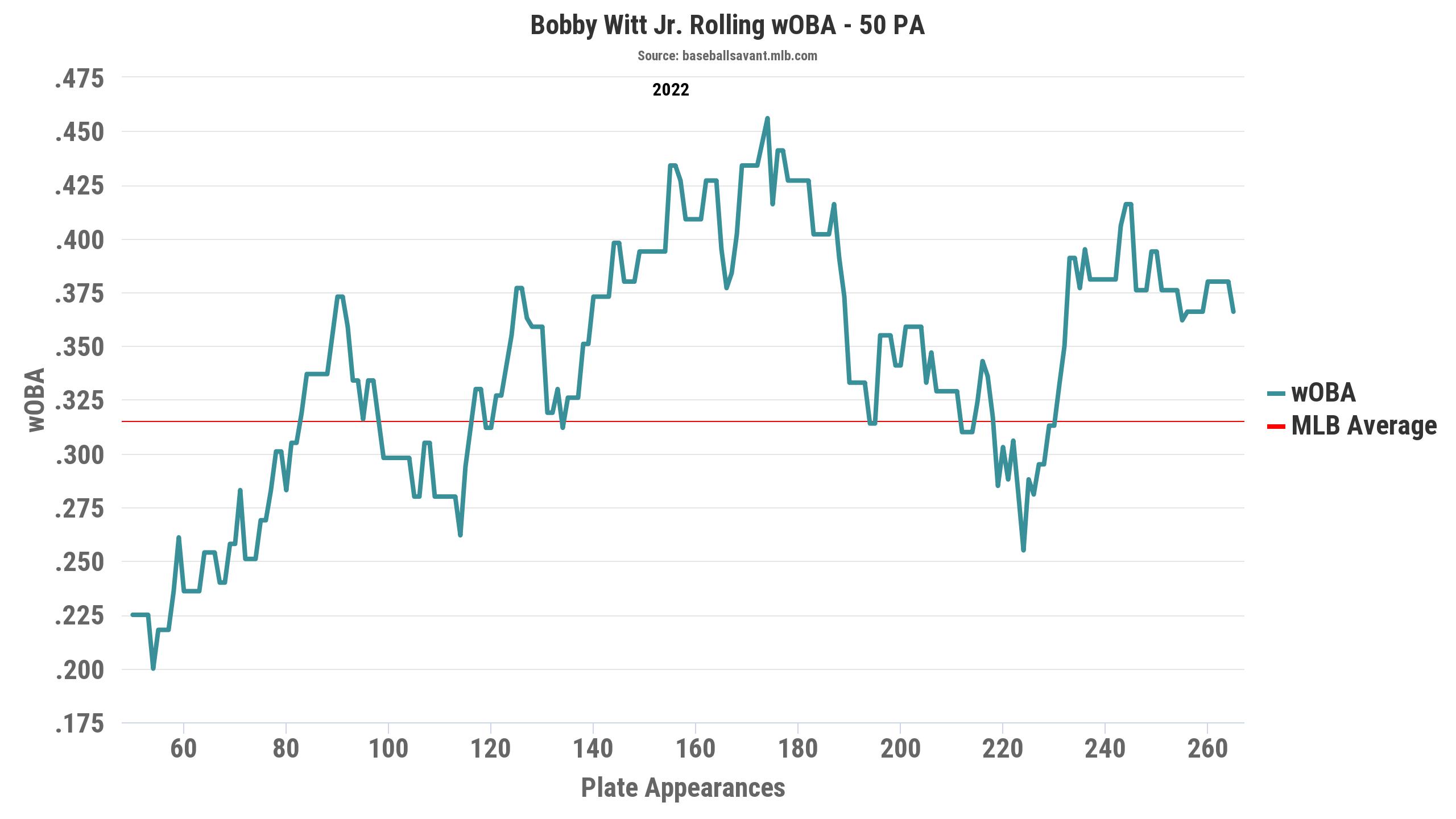 Witt Jr. may not be in the Rookie of the Year conversation (at the moment), but he’s truly having a very fine start to his major league career. Entering the game on Tuesday, he had a 97 wRC+, a number that’s been steadily climbing. Baseball Savant provides a nice visual on rolling rate stats to illustrate how a player is performing relative to the league. Bob’s rolling wOBA chart shows how he found a comfort zone around plate appearance 120 or so.