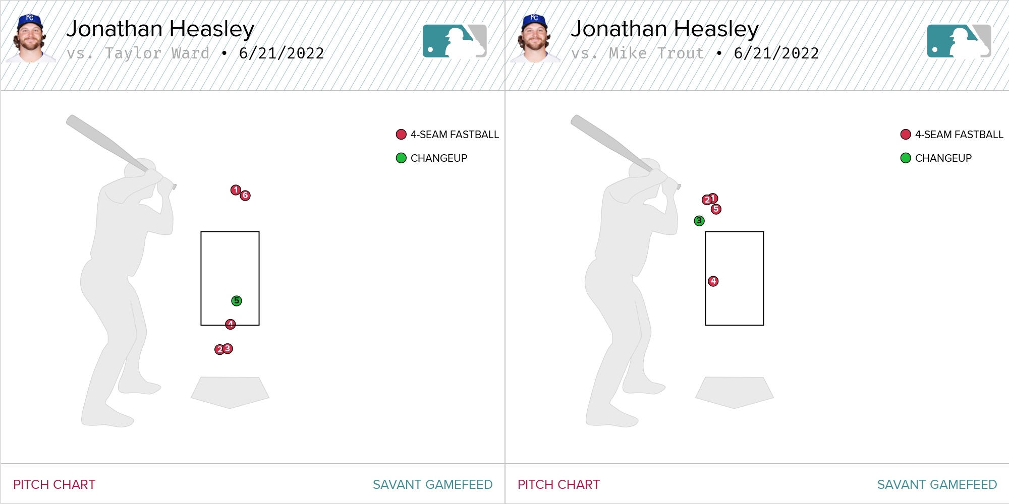 In the sixth and the Angels flipped the batting order for the third time, Heasley ran out of gas. He couldn’t locate his fastball and the velocity was down. These are the pitch charts for the first two batters he faced.