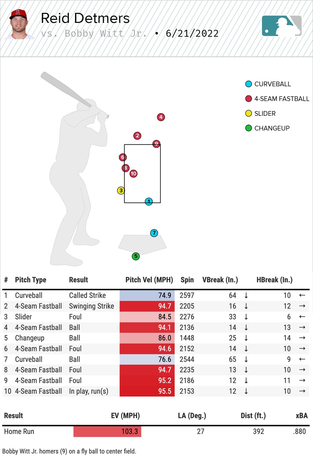 He fouled off pitch number three, a slider on the inside edge that could’ve been called a ball but we’ve all seen those types of two-strike borderline calls go against him this year. Witt Jr. spit on a fastball way up and out of the zone and a change in the dirt. Detmers came back with another fastball on the inner edge for four number two. After a curve that dropped well out of the zone, Detmers went exclusively with the fastball.