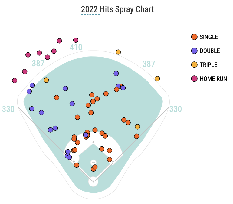 Honestly, he has some impressive plate coverage across the vertical middle of the zone. But the pitch finished more on the inner third, where Witt Jr. posts a .261 ISO (stats are prior to Tuesday’s game). So when the pitch is located there to a right-handed batter, you’re thinking the ball will be pulled to left. If it’s going to right, it's probably because the batter was late and couldn’t get his hands inside the pitch and it ended up a weak jam shot.