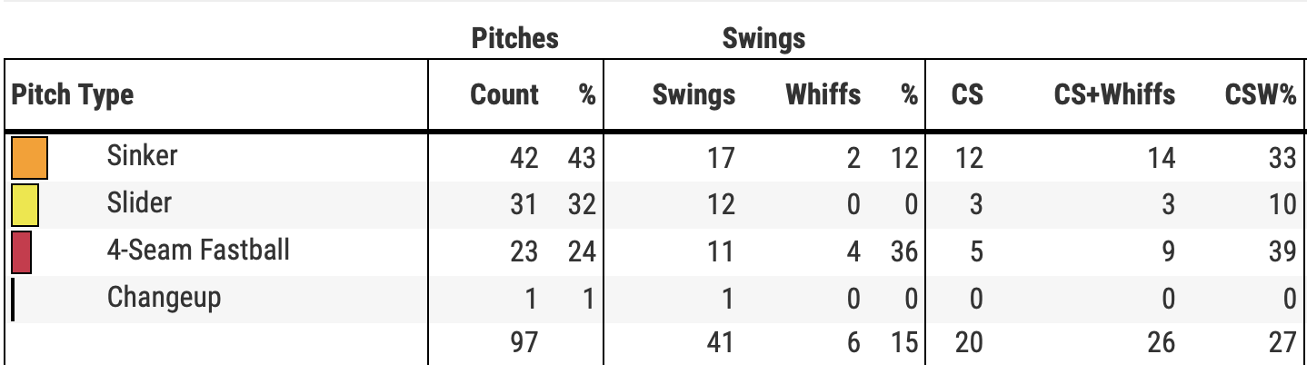 However, the takeaway for me was the complete lack of whiffs on his slider. While his overall slider whiff rate has declined in each of the last two years, it’s still his swing and miss pitch. When he’s not fooling hitters, he’s going to have a long night. It contributed to an extremely subpar 10 percent CSW% as seen above.