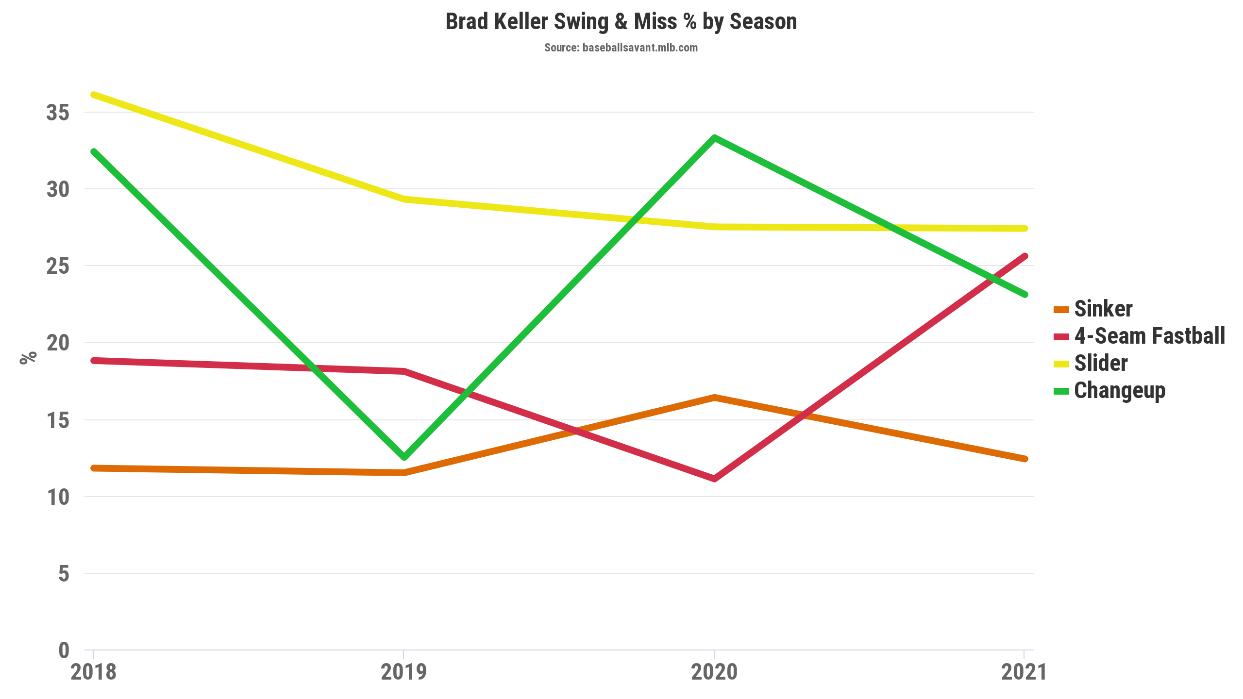 As Keller has bumped his velocity across the board for all pitches, the four-seamer has generated the largest increase for his swing and miss. It drove his whiff rate again in Wednesday’s outing.