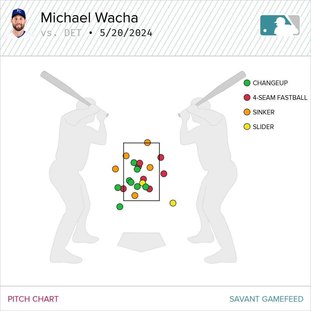 Wacha faced off against these Tigers back on April 28. In that start, he leaned on his changeup 41 percent of the time while he fired his four-seamer 27 percent of all pitches he threw. This was his breakdown.