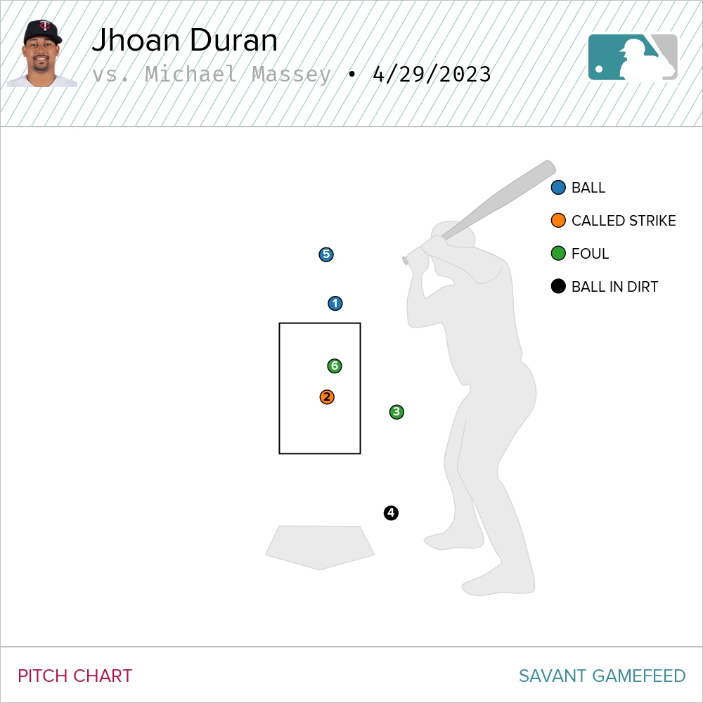 The walk came against the fireballing Twins closer Jhoan Duran. I know for a stone-cold fact that I would not want to stand in the box against that dude. He was throwing 103 MPH gas up in the zone to go along with a dirty curveball. Here’s the pitch chart for the monumental plate appearance.