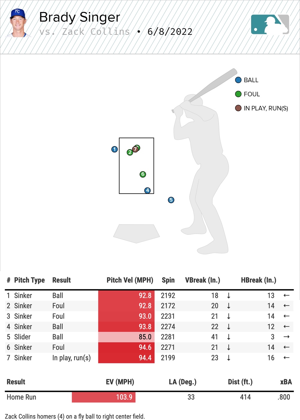 He had already delivered two sinkers in a similar spot as to the one that left the yard. Collins fouled off both. He wouldn’t miss the third. Note the fourth pitch in the above sequence. On a 1-2 count, Singer caught the bottom of the zone on a sinker and it was called a ball. Tough break for sure. But Singer still has to avoid the center of the plate on 3-2. That was just poor execution on Singer’s part.