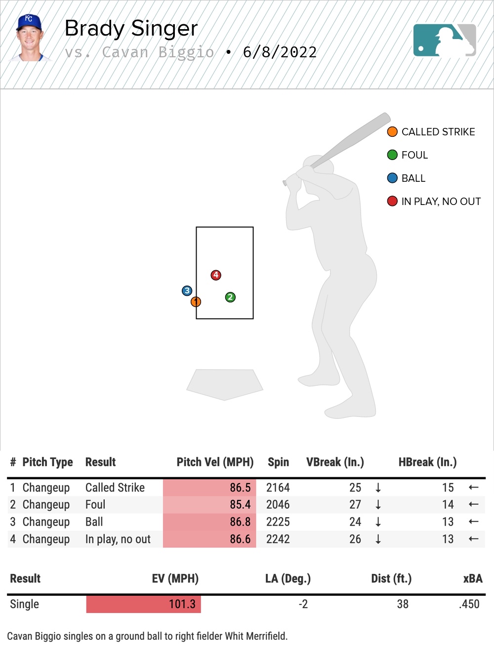 Singer threw just two more changeups. One on 1-0 to Tapia the next time they faced off that was scorched on a line to Nicky Lopez for an out. The other was on a 2-1 pitch to Biggio that was well out of the zone.