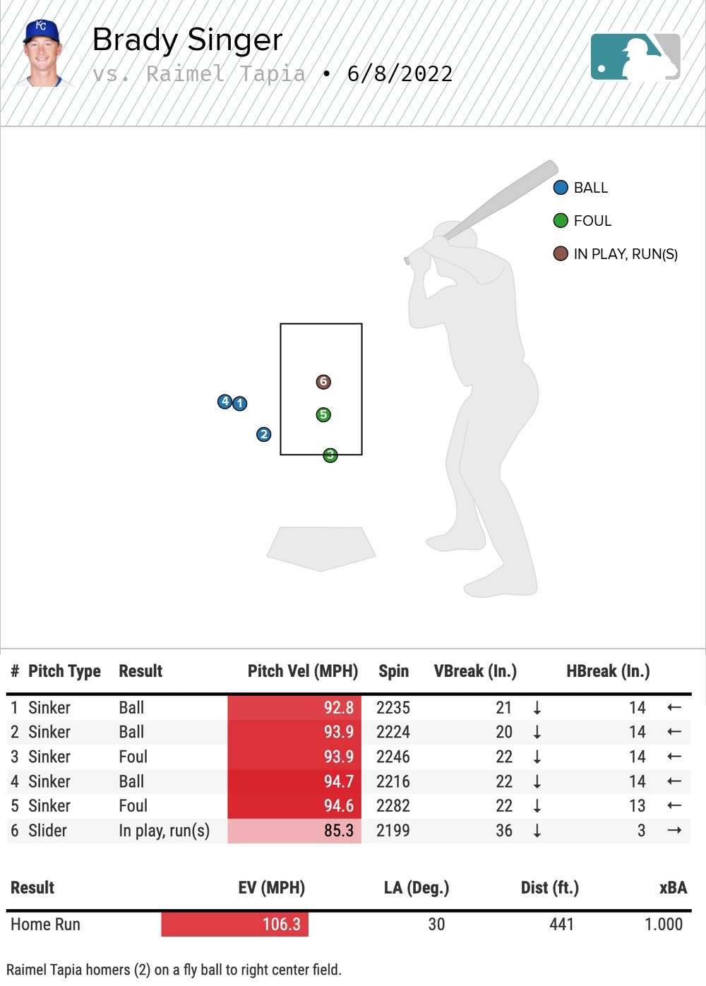 Both plate appearances from the lefties were notable for lack of changeups. Against Tapia, Singer started him with five consecutive sinkers. The sixth pitch was the slider that hung middle-middle.