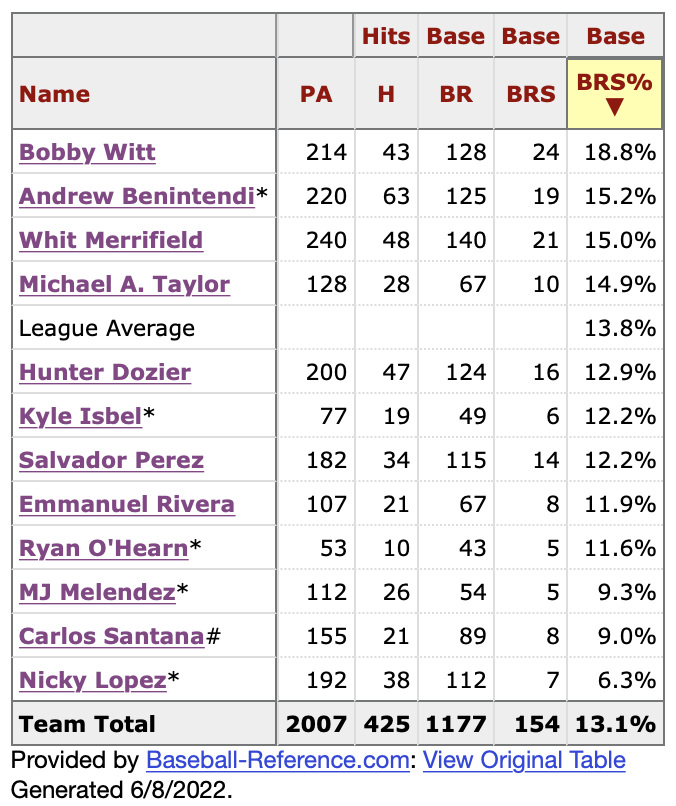 You know that I’m not a fan of RBI as a stat. I prefer Baserunners Scored Percent (BRS%) from Baseball-Reference. Witt Jr. has come up with the second-most baserunners on the Royals and has brought home the most of those runners. That 18.8 percent success rate isn’t necessarily elite—there are over 20 hitters in the majors right now who have had over 100 runners on base and have brought home over 20 percent—but it’s still damn good. And as you can see, Witt Jr. is five percentage points above league average.
