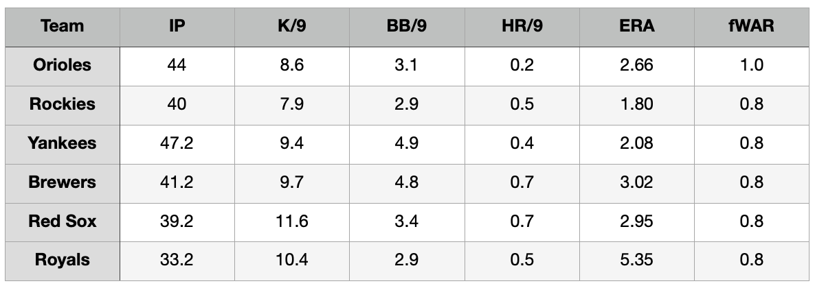 Look at those peripherals. A double-digit strikeout rate, an extremely low walk rate…and they’re keeping the ball in the yard. And then peep that ERA. Hilarious. That’s what happens when your two long guys get lit up in their only outing of the season. That and Jake Brentz giving up two runs in two of his three appearances.