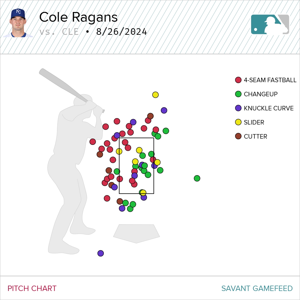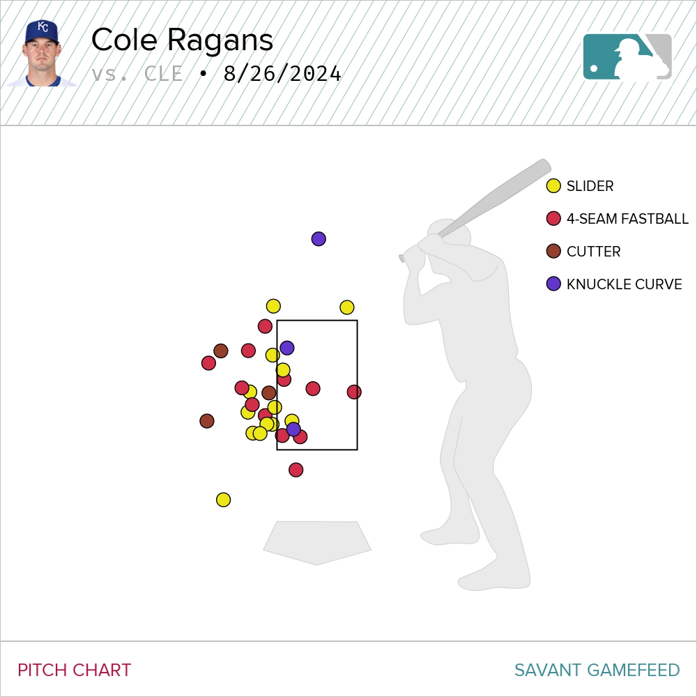 Not everything was sunshine, though. Cole Ragans started the first game and was on the struggle bus all afternoon. He was spraying everything to the glove side, often missing his locations badly. His velocity, which has been trending downward on the four-seam since before the All-Star Break, was way down on both the fastball (1.6 MPH below his average velocity) and his slider (a whopping 2.9 MPH down from his average). I’m aware that some have been sounding the alarm bells regarding Ragans and the drop in velocity on his four-seam. I haven’t necessarily shared those concerns. Yet, after watching him struggle with his command, I’m starting to get a little worried.