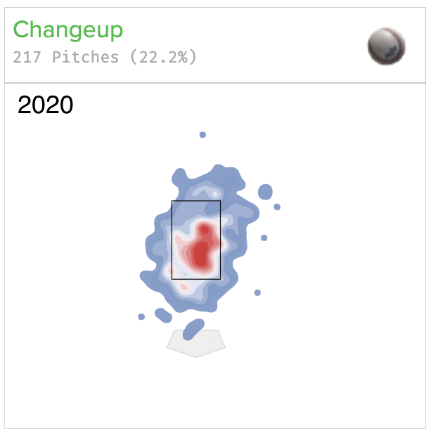 You can see the impact below. Minor’s Hard Hit % jumped across the board with the rate on the change doubling while the rate on the four-seamer increased by 10 percentage points. Yes, the batting average and slugging percentage against the fastball decreased from 2019 to 2020, but his .244 xBA and .459 xSLG tell the tale of a pitcher who was able to evade what could have been maximum damage.