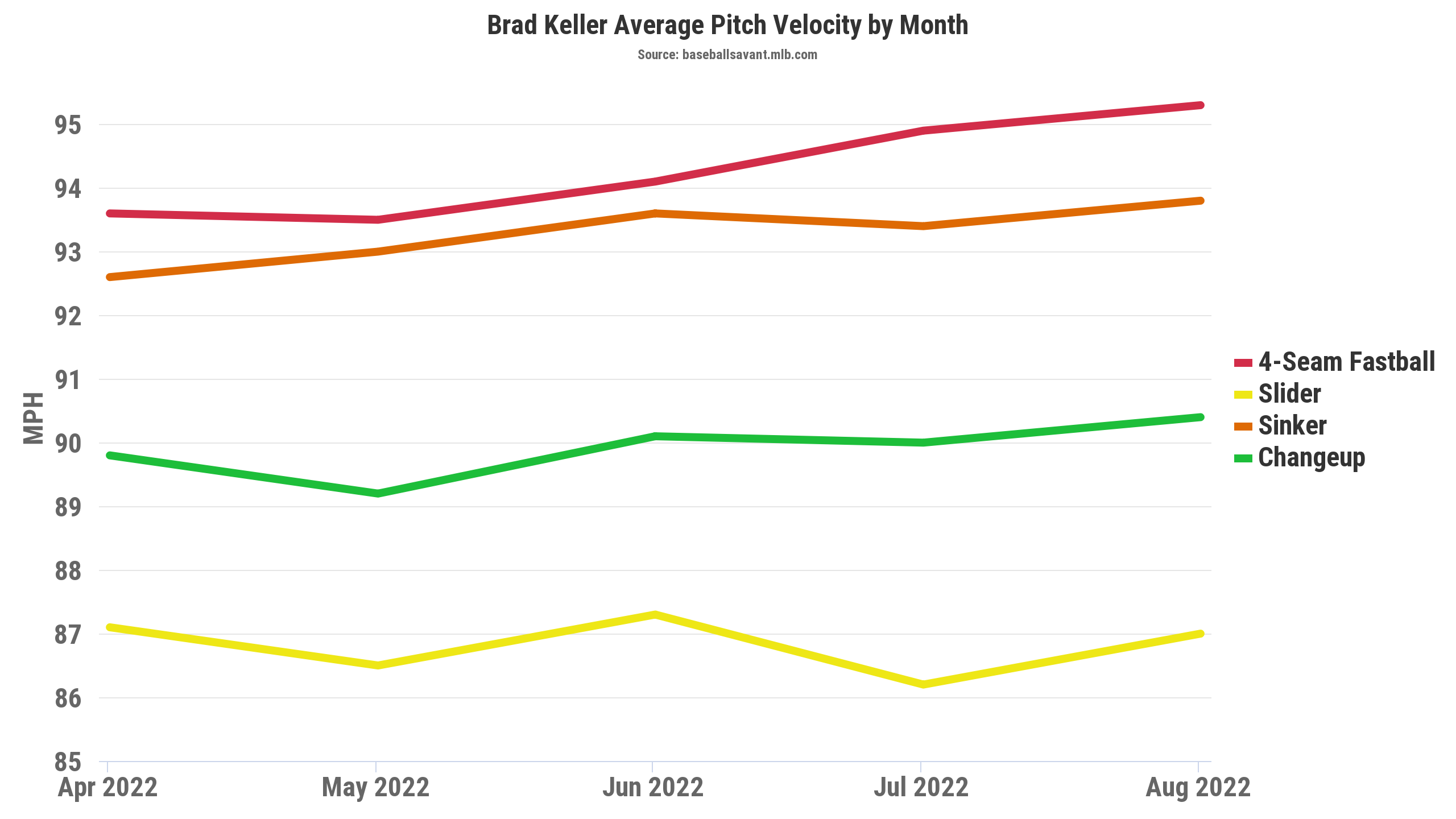 Keller’s fastball velocity has increased as the season has evolved. In fact, the last two months where his four-seamer has averaged 95 MPH that’s the hardest he’s consistently thrown the pitch.