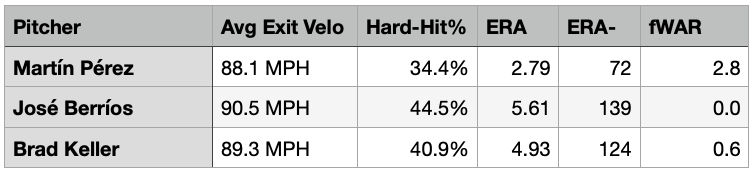 Take a look at two of Keller’s peers who have a similar swinging strike rate. Jose Berrios has a 9.1 percent swinging strike rate, same as Keller. Martin Perez has an 8.7 swinging strike rate, worse than Keller. The difference is Perez gives up softer contact.