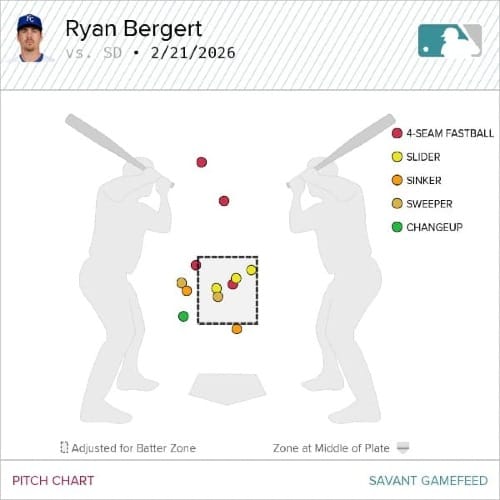 Knuckleballs should be outlawed in spring training. Seriously, save that action for the regular season. San Diego’s Matt Waldron floated that knuckler to get weak contact for the most part while facing the first seven batters of the Royals lineup on Saturday. Meanwhile, Royals starter Ryan Bergert was semi-efficient in his first outing, working around a single and a walk to record three outs on 12 pitches. A couple of his four-seamers were way elevated as was his slider.