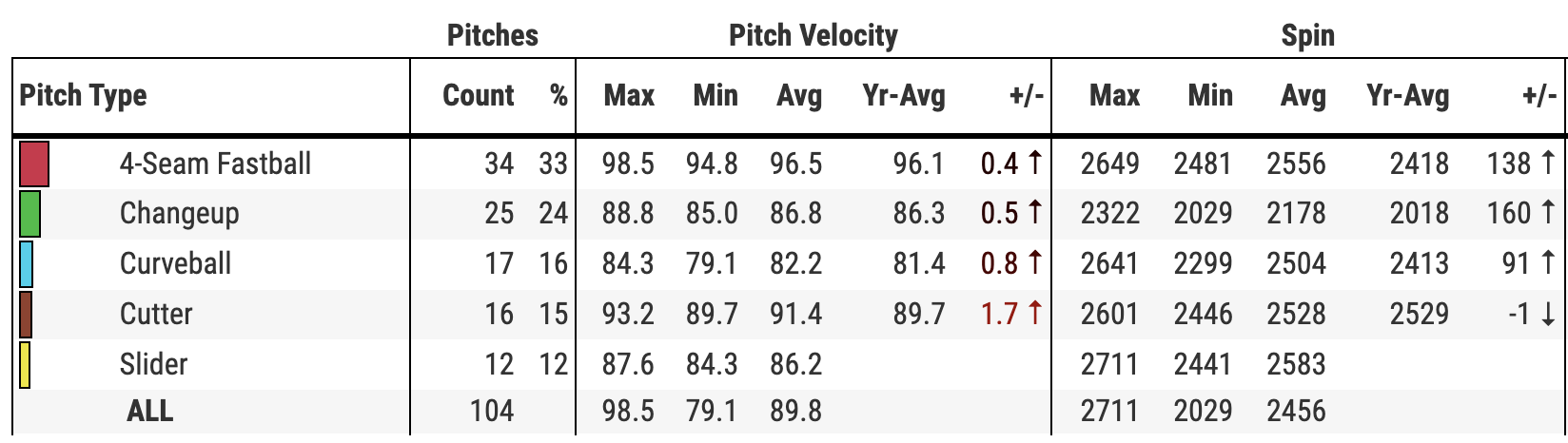 He did it on Monday with a five-pitch array, leading with a four-seamer that averaged 96.5 MPH with an elite spin rate. The changeup was a tremendous weapon, coming in with 10 MPH of separation from his fastball and wrong-footing Boston hitters all night. Of the 13 swings they took, they missed on nine…a 69 percent swinging strike rate on the pitch. Filthy.