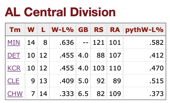 I grabbed the AL Central standings since the All-Star break from Baseball-Reference Monday morning.