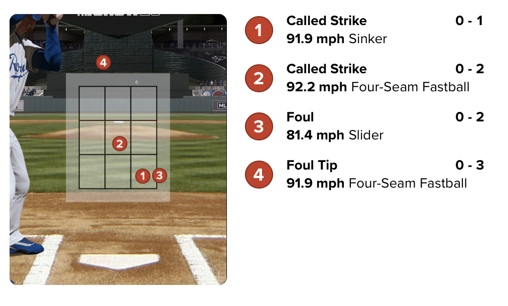 Just as an example, let’s look at the pitch chart against Bobby Witt Jr in the fourth inning with a runner on first and one out.