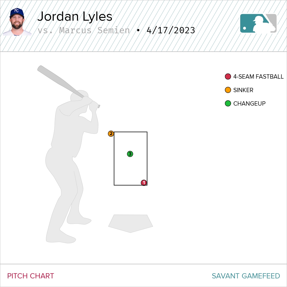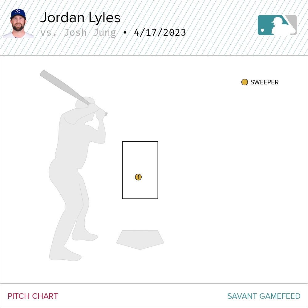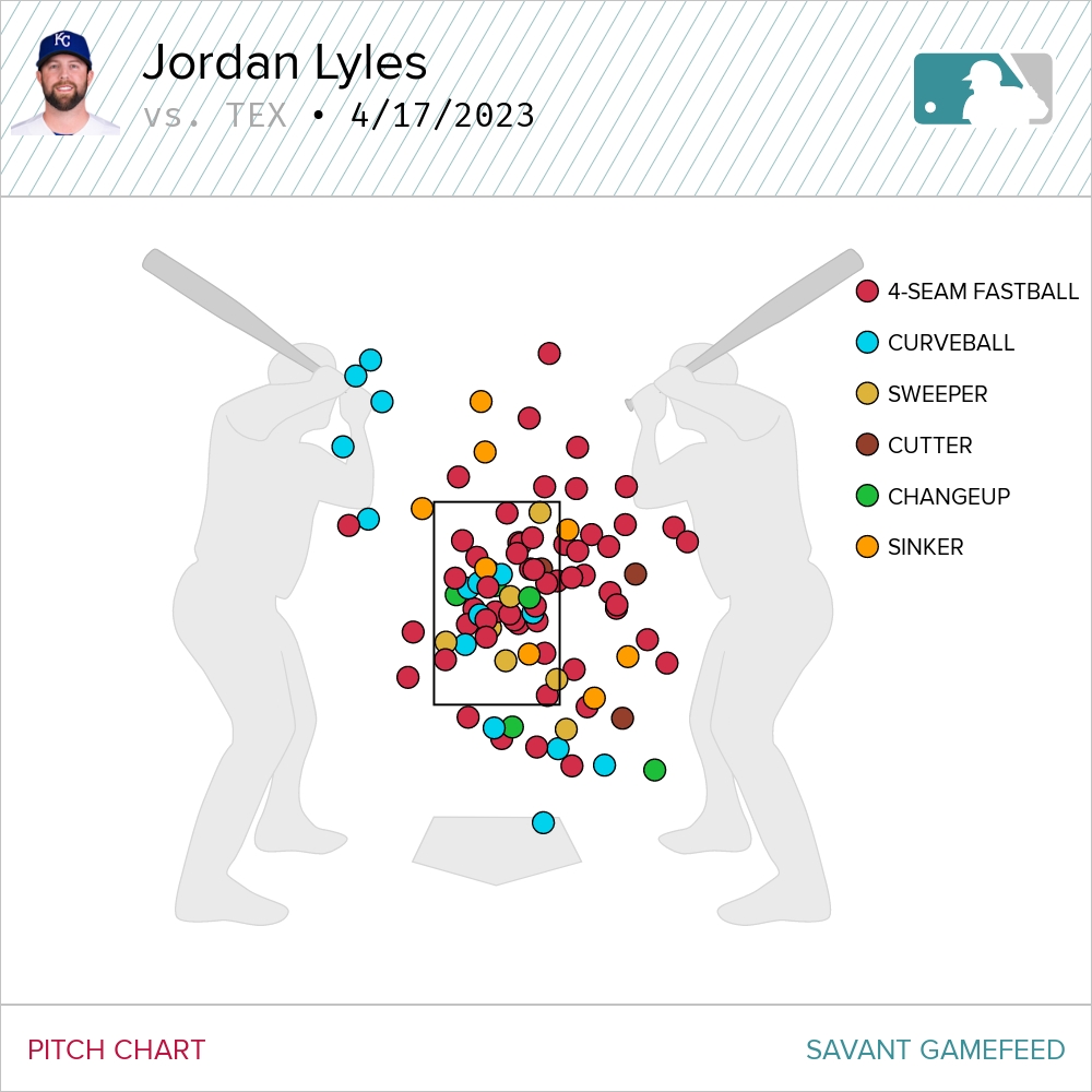 Lyles was living in the middle of the zone pretty much all night. There is barely a single pitch that caught the edge. Like ever. He threw 95 pitches and recorded five swings and misses, striking out three, thanks to the largesse of the home plate umpire.