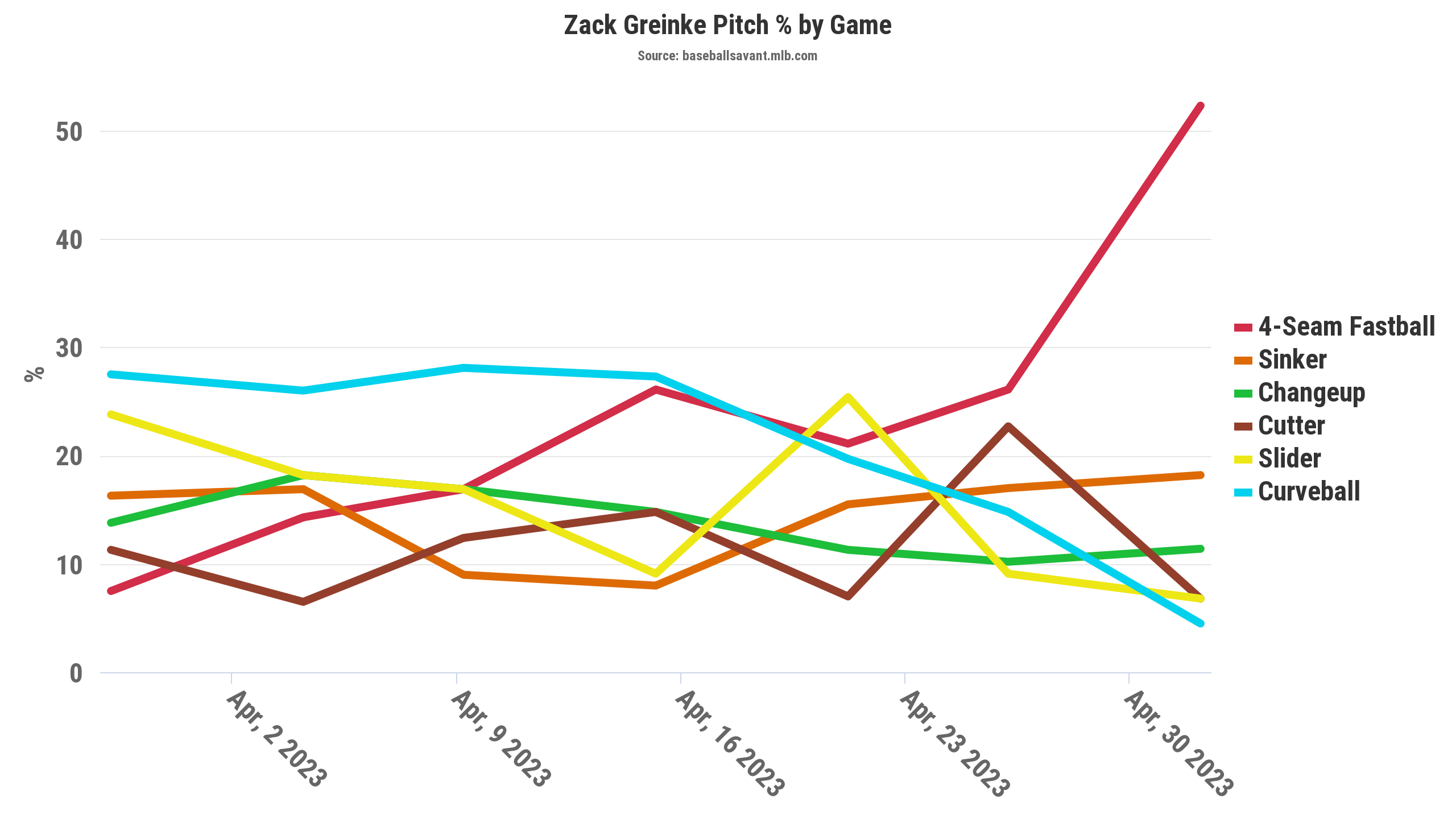 I should note that he’s obviously made the decision to move away from the curve, despite it being his number-one offering through his first four starts. It hasn’t been a good pitch for him to this point. If he locates his fastball as he did on Wednesday and compliments it with a sinker—which has been a solid pitch for him—along with the changeup, that’s what’s working right now.