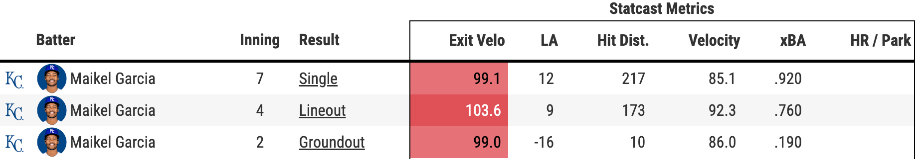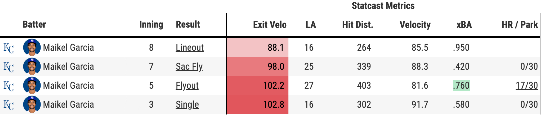 That’s seven plate appearances with the ball in play, six of which had exit velocities 98 MPH or greater. Also, six balls were hit in the air. And check out those xBAs. Yeah, he only has two singles, but damn. After the game, Quatraro called out Garcia’s sacrifice fly as one of the key plays of the game. After back-to-back singles to open the inning, it scored Pratto from third, providing the Royals with a 3-0 cushion. They would go on to hit three consecutive extra-base hits to double that lead.