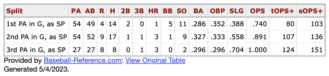The batting average and on-base percentage actually go down, but the slugging jumps up. It’s notable that he’s allowed three home runs in 54 plate appearances the second time through while allowing three in 27 PAs the third time. I left the tOPS+ (his opponent’s OPS+ relative to his own numbers) and the sOPS+ (his opponent’s OPS+ relative to the league for that split) to underline that Greinke’s production absolutely decreases each time through the order. (Remember, anything over 100 is above the league average, so for the third time through the order, Greinke’s OPS+ is personally 24 percent worse than his overall production while it’s 51 percent worse than the league as a whole for that particular split.)