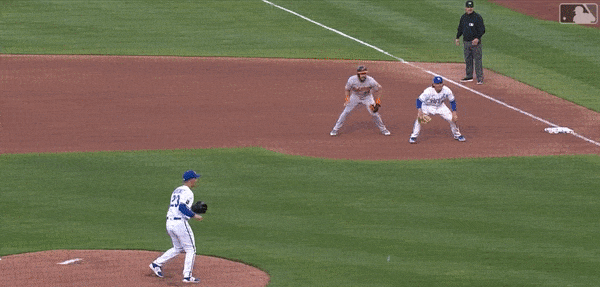 This was the first play of the game. By just getting to the ball, Pratto saved a double, maybe a triple. And don’t sleep on the underhand feed to Greinke covering first. It was perfect. That’s what Pratto brings with his glove at first. (And we all know about Greinke’s fielding ability. He’s breaking from the mound immediately.)