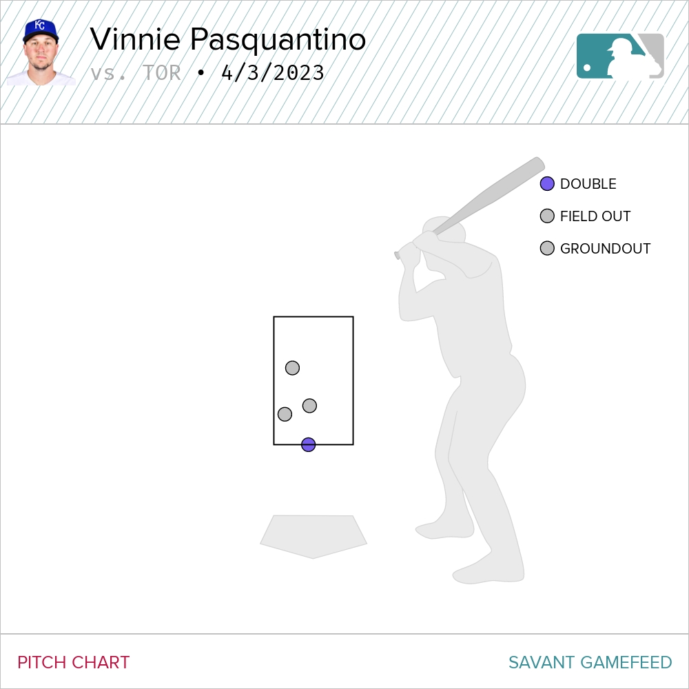 Do you think Vinnie Pasquantino is itching to hit? In each of his first three at-bats, he was uber-aggressive, swinging at the first pitch. The catch is, Blue Jays starter Jose Berríos didn’t feel like altering his approach, throwing a slurve to open each at bat. After back-to-back flyouts in each of his first two at-bats, Vincenzo laced that third slurve down the line in right for a run-scoring double. He was first pitch swinging again in his fourth and final at-bat of the night. He finished 1-4. These were the only pitches he saw on Monday.