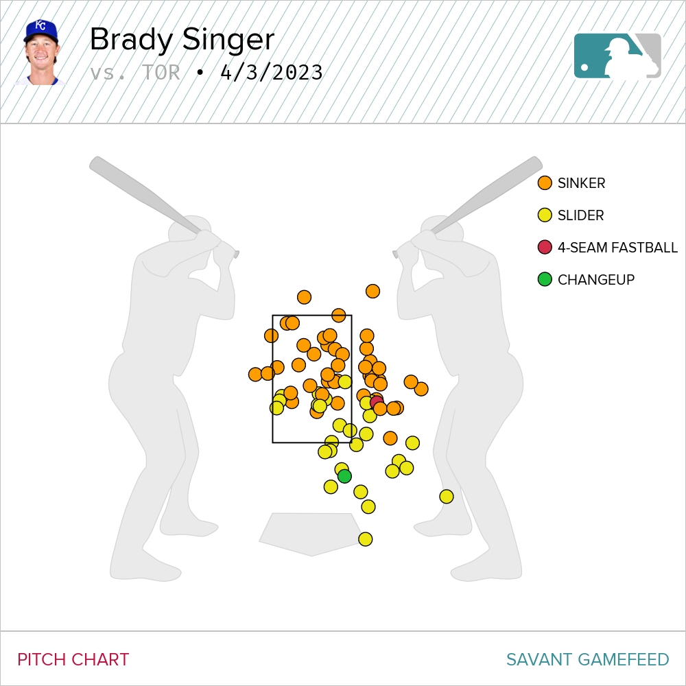 It was the usual game plan for Singer. Sinkers up, sliders down. The two-seamer showed a bit of tail and he was locating it really well. The slider was a nice compliment to that.