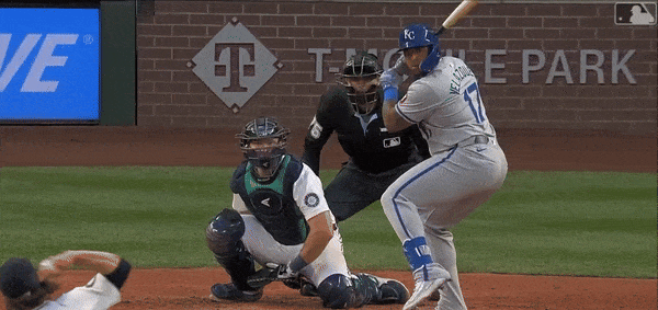 The Royals designated hitter had gone since April 4 without a home run, a span of 101 at bats. He had struck out in his previous two at bats against Mariners starter Logan Gilbert, missing on a 97 MPH four-seamer down the chute in the second and then fishing on an 81 MPH splitter well out of the zone in the fifth. As so often happens in this game, after looking totally helpless in those earlier plate appearances, Velázquez strode to the plate in the top of the seventh in the most important situation in the game.