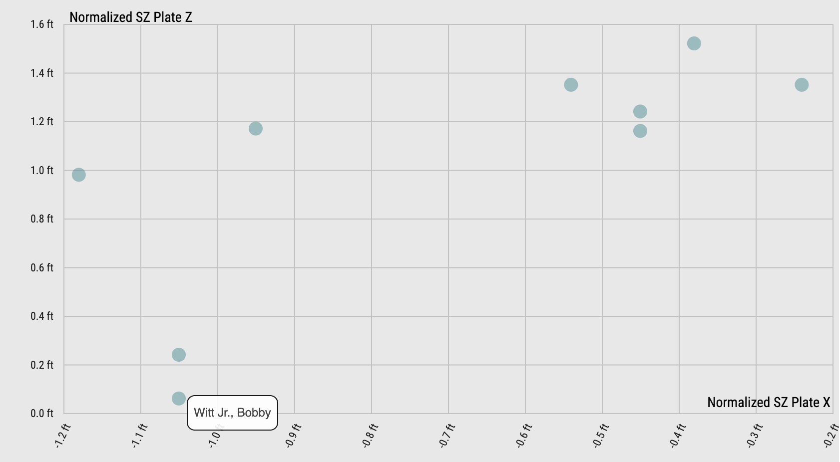 Most of the pitches out of the zone were more elevated than inside. We know how hitters love the high cheese and most of them chase, rarely making contact, especially on the higher velocity fastballs. This chart shows that Witt’s home run was one of three that came on a pitch well inside.