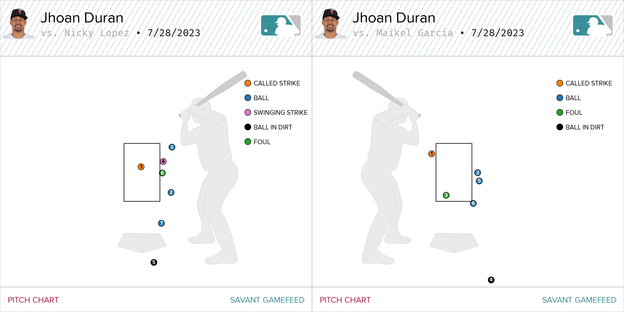 Duran was working glove-side to both. Lopez fought off a 3-2 pitch on the inner half before spitting on a low four-seamer at 101 MPH. Garcia didn’t bite on a spiked curveball on a 1-2 count and then watched the next two ride just off the outer edge. The wrinkle in this situation was Kyle Isbel was sitting on second to open the inning as the obligatory Manfred Man. Isbel swiped third during Lopez’s PA. Lopez then stole second while Garcia was at the plate.
