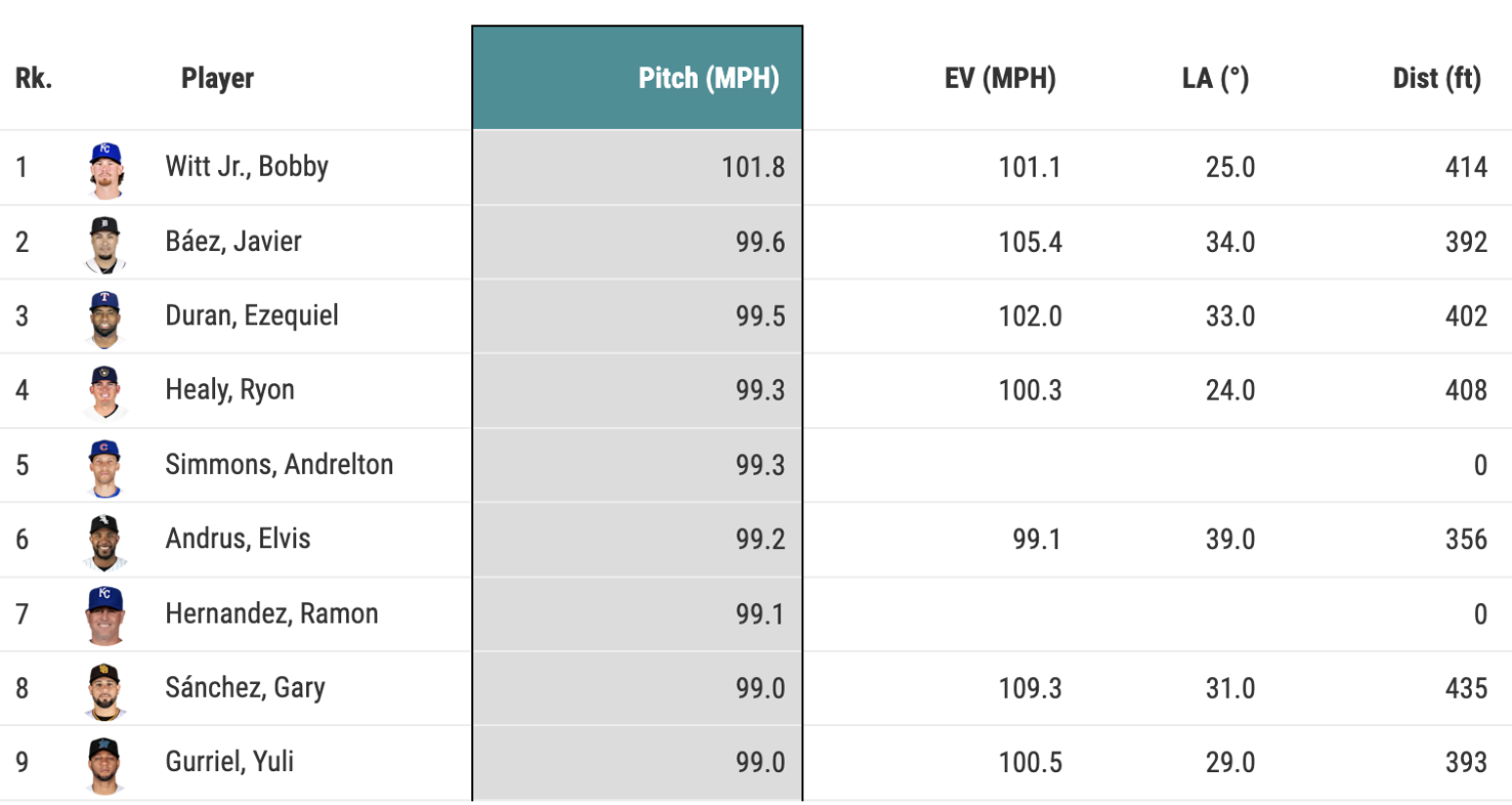 What Witt did to that baseball was completely insane. How about a little perspective? Since going back to 2008, there have been nine times when a right-handed batter turned on a 99 MPH or faster pitch out of the strike zone and launched a home run. No one had ever done it on a pitch that topped 100 MPH. Until Friday.