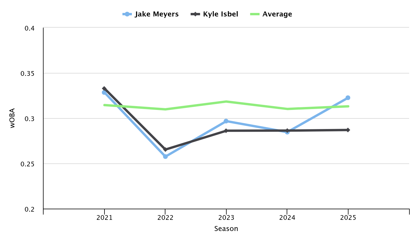 That’s kind of wild. Until 2025 when Meyers cut his strikeout rate and bumped his walk rate a bit, they’ve been basically the same player. Although I would probably rate Isbel as a better overall defender.
